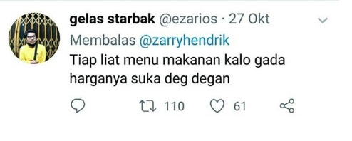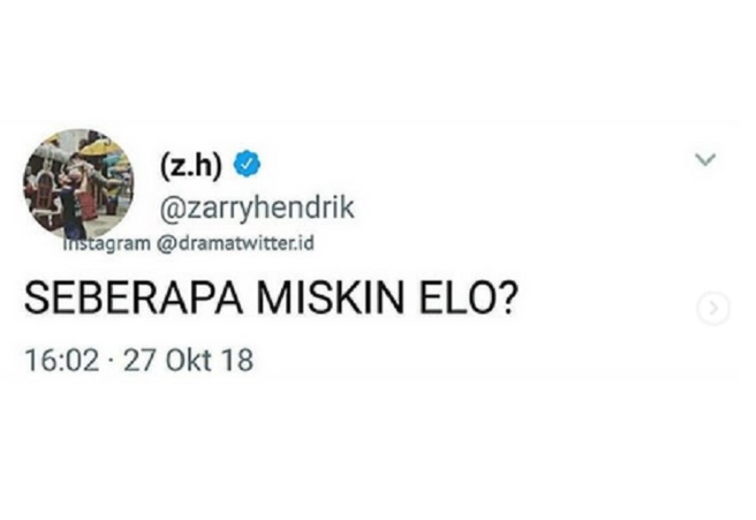Di akun Twitter miliknya, @zarryhendrik, ia menuliskan kata-kata ‘seberapa miskin elo?’ dengan huruf kapital. Beberapa pengikutnya pun membalas dengan tweet-tweet yang mengundang tawa.