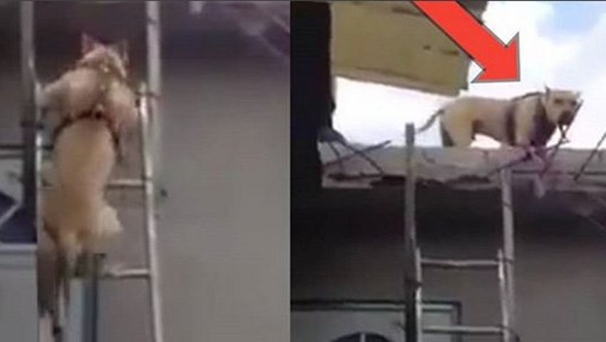 Anjing tersebut awalnya kebingungan dan memasang wajah melas saat melihat posisinya berada di ketinggian.