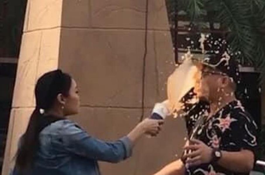 Perseteruan keduanya akhirnya berakhir ketika si wanita menyiramkan jus ke wajah si pria dan berlalu pergi.