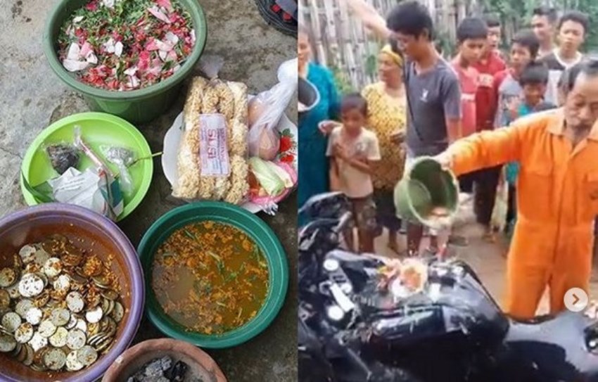 Motor Yamaha R15 berkelir hitam itu sedang dimandikan kembang oleh seorang pria yang diduga orang yang dituakan disana.