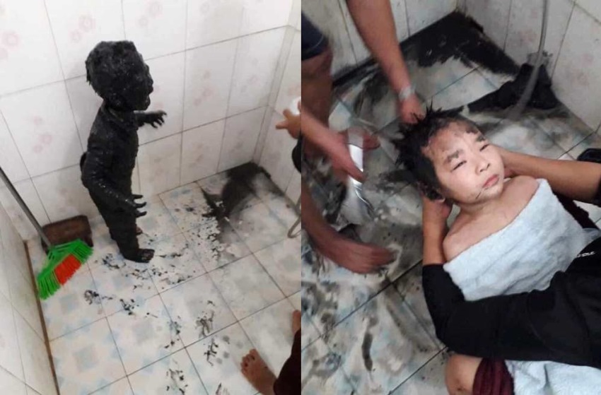 Dan baru-baru ini di media sosial beredar sejumlah foto yang memperlihatkan seorang bocah yang menangis ketika tubuhnya terlumuri cairan berwarna hitam.