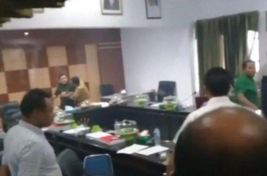 Karena adanya kejadian itu, ruang rapat pun berubah ricuh. Sejumlah benda terlihat berterbangan dan membuat kaca ruang DPRD pecah.