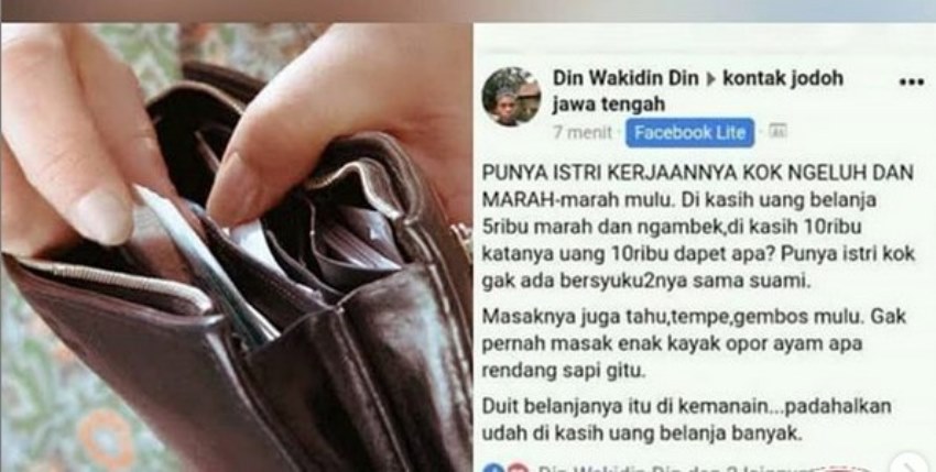 “PUNYA ISTRI KERJAANNYA KOK NGELUH DAN MARAH-marah mulu. Di kasih uang belanja 5ribu marah dan ngambek,di kasih 10ribu katanya uang 10ribu dapet apa? Punya istri kok gak ada bersyukur2nya sama suami.