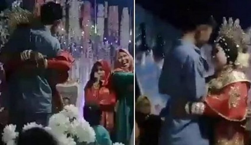 Dalam video yang beredar di media sosial itu tampak seorang pria dipeluk erat oleh mempelai wanita yang merupakan mantan kekasihnya.