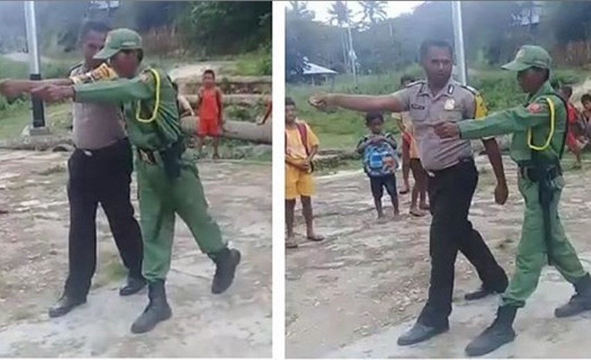 Lelah mengajarkan secara verbal, polisi itu pun membimbing hansip tersebut dengan memegang tangan dan membantu kaki hansip itu bergerak.