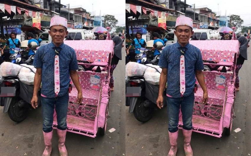 Dalam foto unggahan akun Facebook Asep Rosyadi Permana tampak sang tukang becak memakai kemeja lengan pendek dan celana jeans panjang yang dipadukan dengan dasi pink gambar Hello Kitty, dan peci warna pink yang juga sama bergambar Hello Kitty.