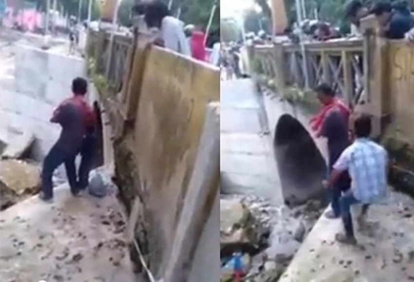 Dalam video yang beredar di media sosial tampak seorang pria tengah duduk di pinggir jembatan dan menghadap ke sungai.