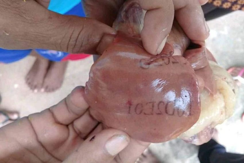 Pada hati ayam tersebut ada tulisan angka dan huruf, dua baris. Hampir semuanya tercetak terbalik. Misalnya angka 2 tertulis terbalik menyerupai ‘S’ atau 5.