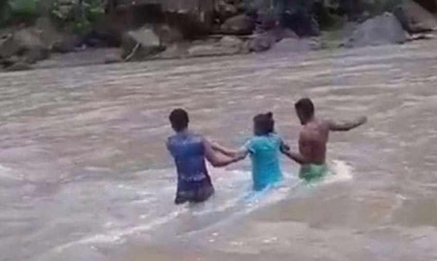 Ibu hamil itu dituntun untuk melintasi arus air sungai. Ia harus menyebrang sekitar 100 meter dengan ketinggian air hingga leher orang dewasa.