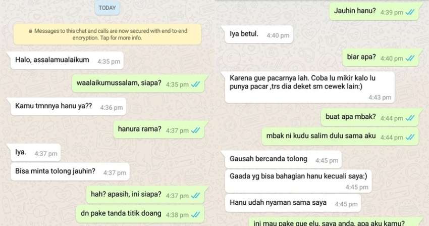 Entah bagaimana caranya Maemuna pun dapat nomor WhatsApp kakak pacarnya. Ia kemudian melabrak wanita yang diduga selingkuhannya itu melalui WhatsApp.