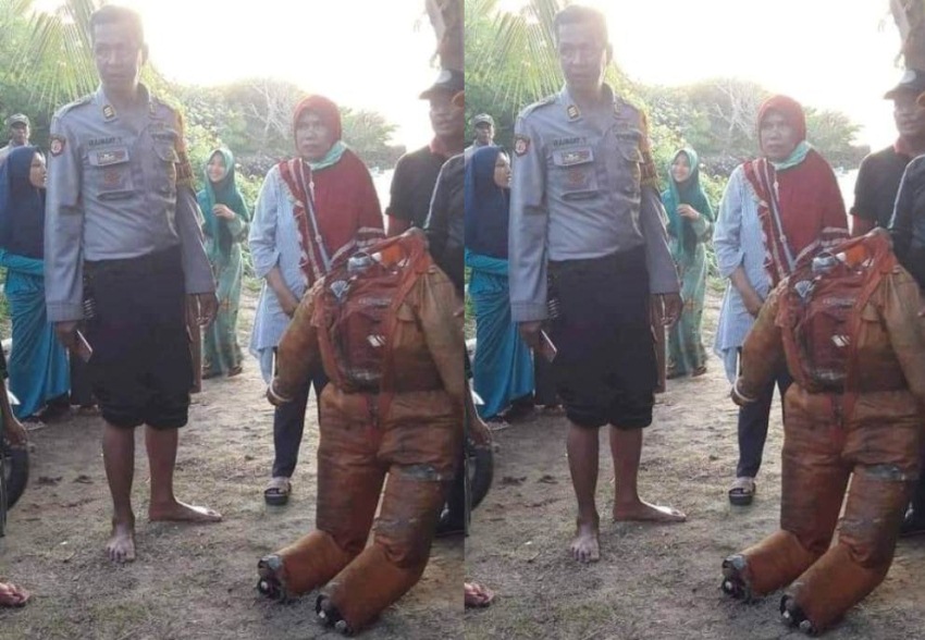 Botol-botol plastik tersebut dikemas dengan rapih ke dalam baju katelpak, sehingga dari kejauhan sangat mirip dengan mayat terapung.