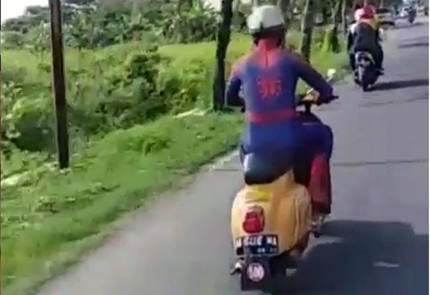Dan baru-baru ini di media sosial beredar video aksi seorang pria berkostum Spiderman yang mengendarai motor vespa.