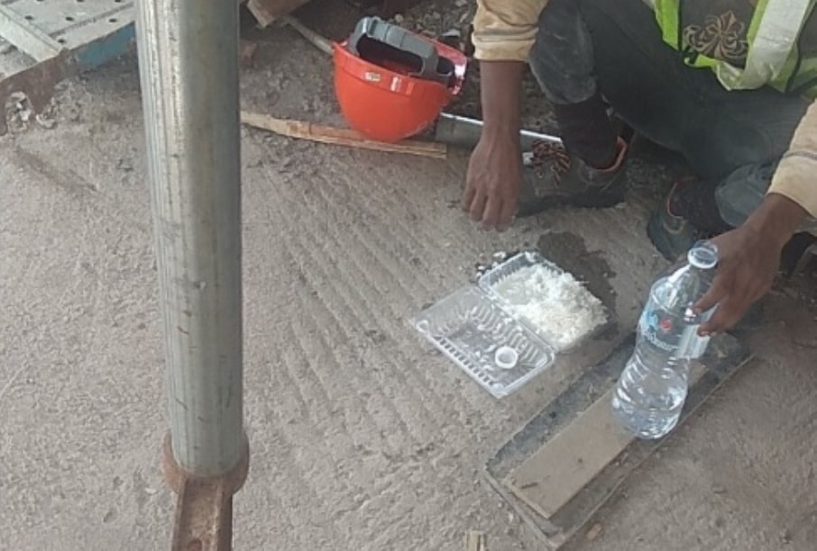 Dengan wadah plastik, pekerja itu hanya makan tanpa lauk apapun. Mirisnya, di wadah plastik itu ada genangan air. Pekerja itu sepertinya menambahkan air mineral sebagai kuahnya.