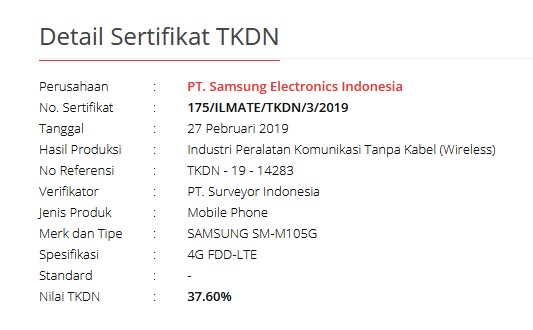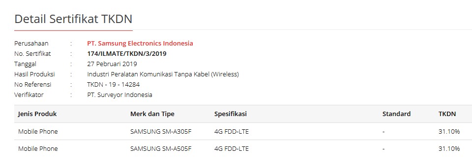 Mengusung nomor model masing-masing SAMSUNG SM-M105G, SAMSUNG SM-A305F dan SAMSUNG SM-A505F. Ponsel-ponsel pabrikan Korea Selatan ini berhasil meraih persentase TKDN sebesar 31.10% dan 37.60%.