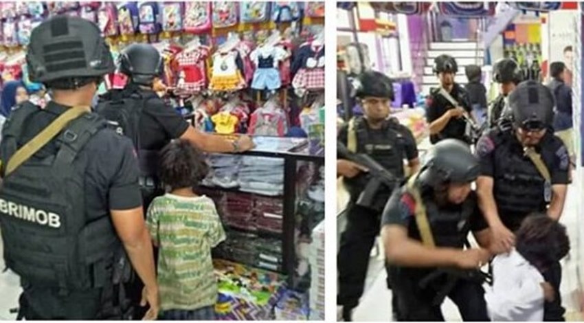Dalam foto unggahan akun tersebut terlihat sejumlah anggota Brimob tersebut mengawal Melati belanja kebutuhan sekolah mulai dari baju hingga alat tulis.
