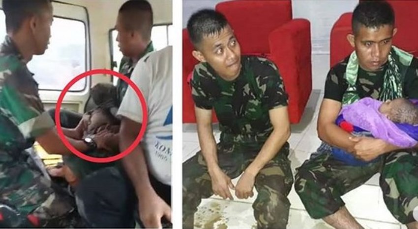 Untuk mengevakuasi korban, para personil TNI dan warga pun harus memotong kayu yang menjepit tubuh bayi itu menggunakan dua gergaji.