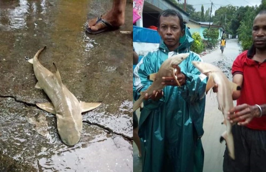 Akun Twitter @jayapuraupdate belum lama ini memposting penemuan ikan yang bentuknya mirip dengan hiu yang terbawa hanyut tepat di aliran banjir dari arah Gunung Cycloops.