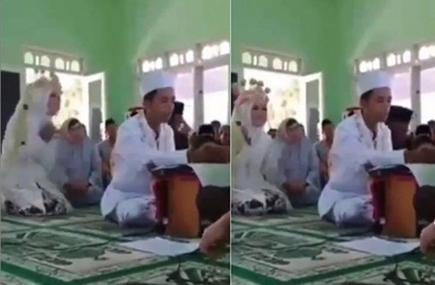 Tampak sang mempelai wanita itu duduk di belakang mempelai pria saat ijab kabul berlangsung. Setelah penghulu menyatakan ijab kabulnya sah, si wanita pun langsung bertepuk tangan kegirangan.
