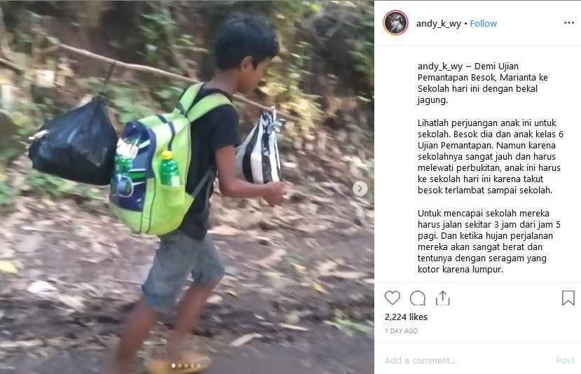 Dan beberapa waktu lalu di media sosial viral sebuah video yang mengisahkan tentang perjuangan seorang anak SD yang harus berjalan kaki demi mengikuti ujian pemantapan hari Senin (1/4) kemarin.