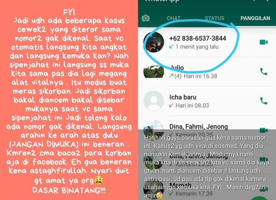 “Jadi udh ada beberapa kasus cewek2 yang diteror sama nomor2 gak dikenal. Saat vc otomatis langsung kita angkat dan langsung ke muka kan? Nah si penjahat ini langsung ss muka kita pas dia lagi megang alat vitalnya,” demikian snap WA Syiifa.