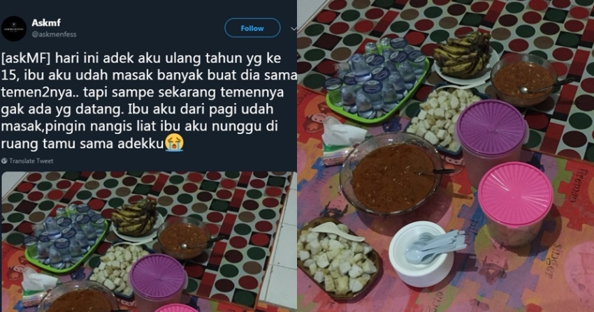 “hari ini adek aku ulang tahun yg ke 15, ibu aku udah masak banyak buat dia sama temen2nya.. tapi sampe sekarang temennya gak ada yg datang. Ibu aku dari pagi udah masak, pingin nangis liat ibu aku nunggu di ruang tamu sama adekku”, tulis @nyerahdahh dalam cuitannya.