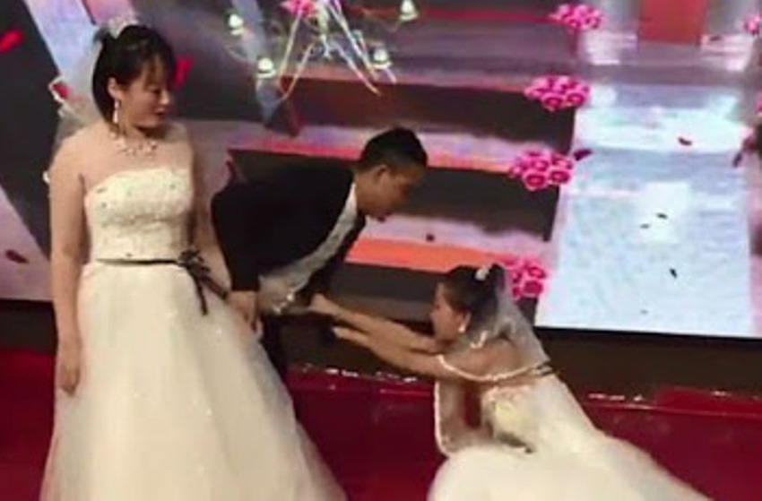Saat sang mantan pacar tengah berlutut sambil memegang tangan mempelai pria, terlihat sang mempelai wanita yang terlihat pergi meninggalkan keduanya.
