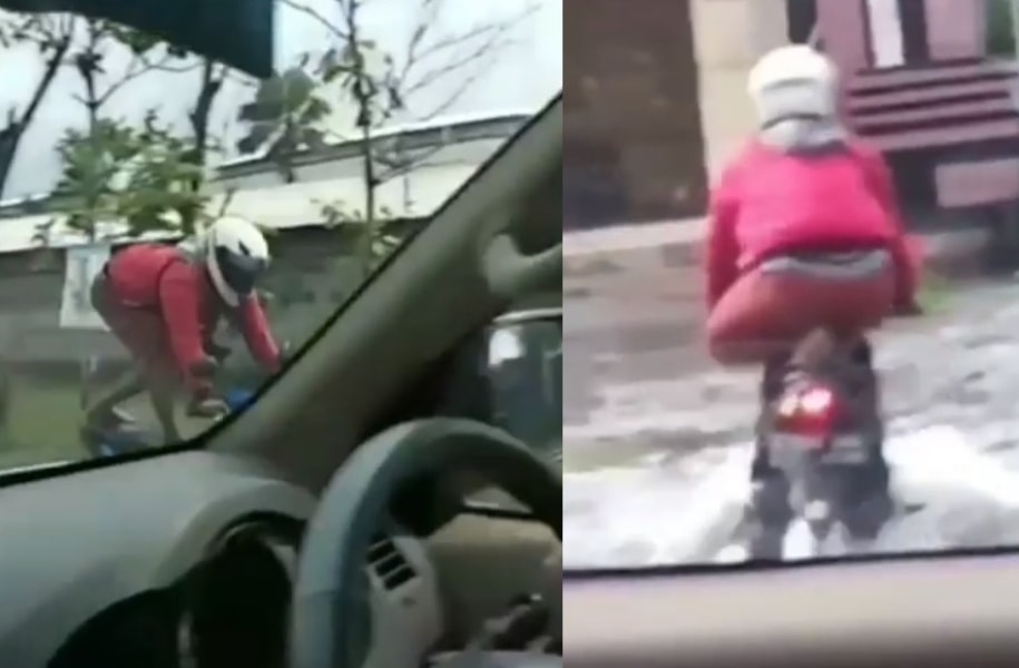 Uniknya, pengendara motor itu berdiri di atas jok dengan posi kendaraan yang terendam air sehingga tak ubahnya pengendara motor itu laiknya sedang mengemudikan jet ski.