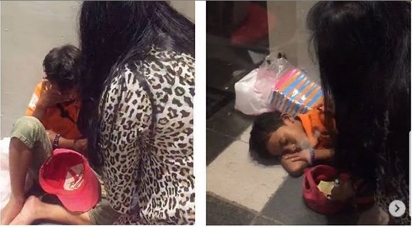 Diduga saking lelahnya berjualan dan hari pun menunjukkan sudah malam, bocah itu sampai ketiduran di depan gerai Pizza Hut tersebut.
