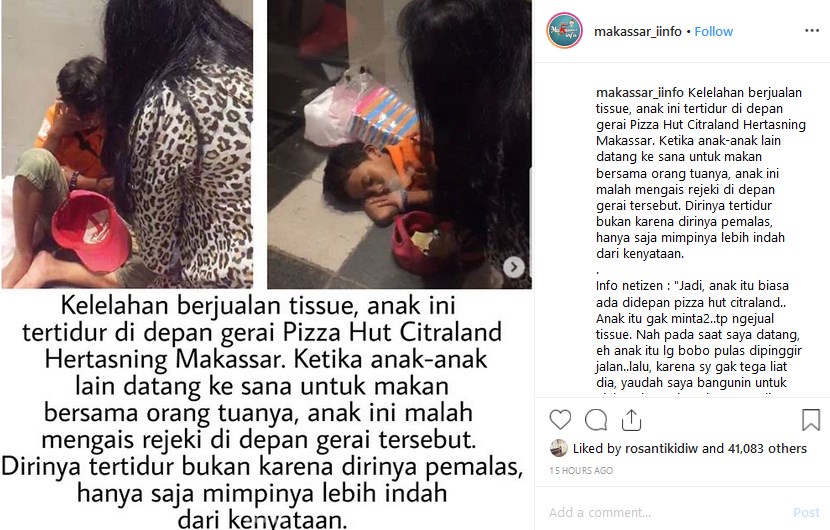has_ed90, “Saya pernah bonceng ini anak beberapa hari yg lalu sekitaran jam 10 malam, minta tumpangan di pertigaan kfc citra land ke arah patung massa. Katanya abis cari uang buat sekolah. Allah with you dek”