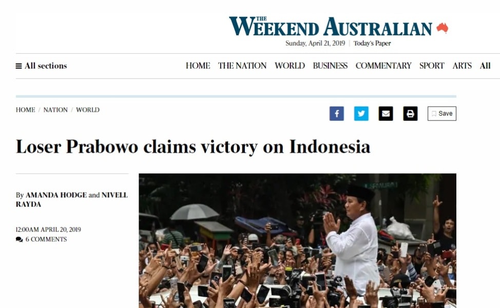 RANCAH POST – Sebuah media asing asal Australia, The Weekend Australian, melansir berita terkait klaim Prabowo Subianto sebagai pemenang Pilpres 2019.