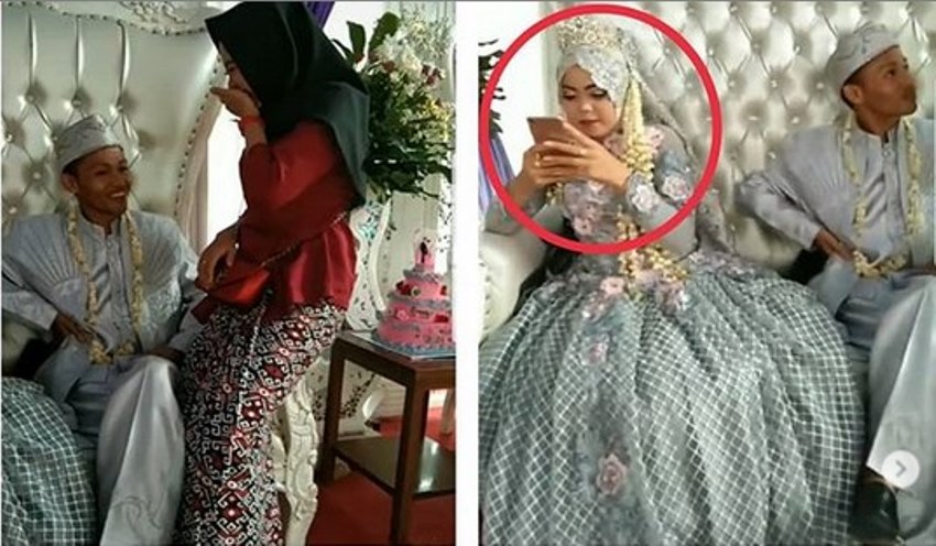 Sang mempelai wanita yang ada di samping suaminya itu duduk santai sambil otak-atik handphonenya tanpa menghiraukan sang suami yang tengah ngobrol dengan seorang wanita yang diduga adalah mantannya.