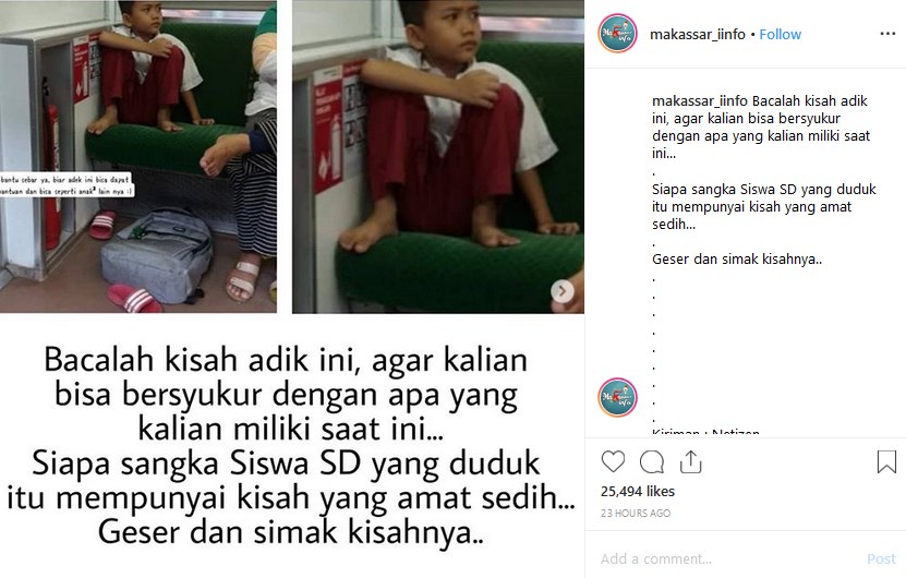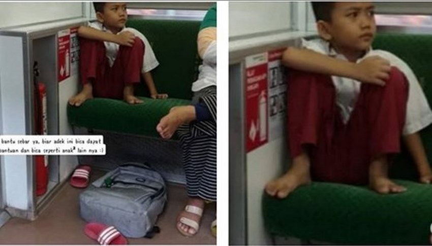 Dalam unggahan akun @makassar_iinfo itu memperlihatkan potret seorang bocah laki-laki yang memakai seragam SD tengah duduk di kursi kereta.