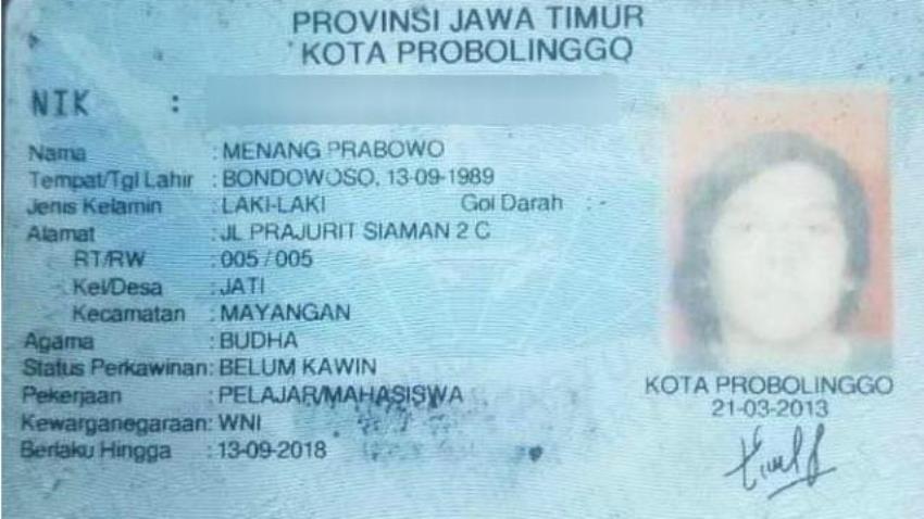 Pria tersebut beralamat di Jalan Prajurit Kelurahan Jati, Kecamatan Mayangan, Kota Probolinggo, Jawa Timur, dengan nama Menang Prabowo.