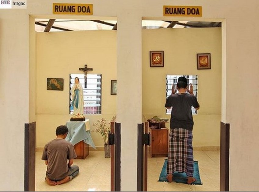 Dan belakang ini publik dibuat adem dengan viralnya foto dua ruang agama berbeda yang bersebelahan. Dua ruang doa itu diperuntukan bagi umat muslim dan Katolik.
