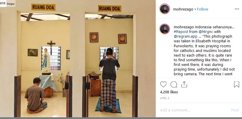 Saya memuji pihak rumah sakit yang menyediakan kamar-kamar doa ini. Mereka tidak mengabaikan kebutuhan orang-orang rumah sakit untuk berkomunikasi secara rohani dengan Tuhan. Penempatan kamar ini juga menunjukkan keindahan hidup dalam harmoni dan kedamaian”, tulis Reza dalam unggahannya.