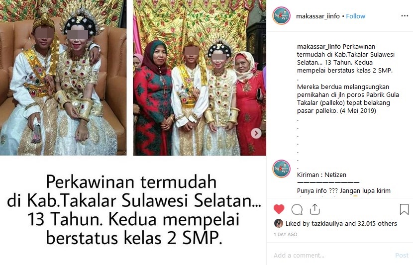Baru-baru ini publik kembali dihebohkan dengan pernikahan dini pasangan di Kabupaten Takalar, Sulawesi Selatan. Kedua mempelai masih berusia 13 tahun dan sama-sama berstatus pelajar kelas 2 SMP.