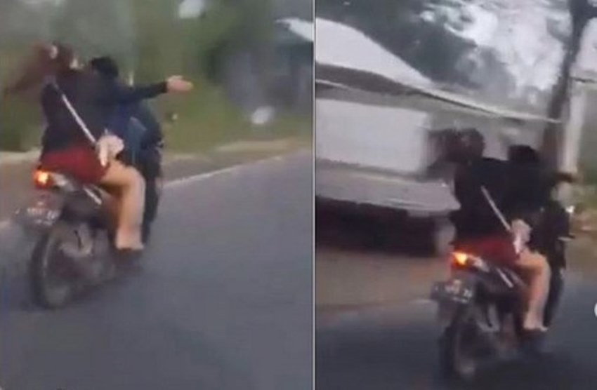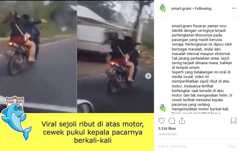 Keduanya tampak tengah bertengkar saat berada di atas motor dan tidak mengenakan helm. Si cewek terlihat memukul kepala cowoknya yang sedang mengemudikan motor berkali-kali.