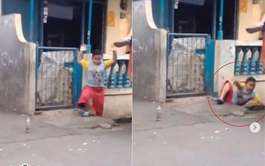 Karena tak melihat keadaan di belakangnya, kaki bocah itu pun terperosok ke dalam selokan hingga membuatnya terjatuh ke dalamnya.