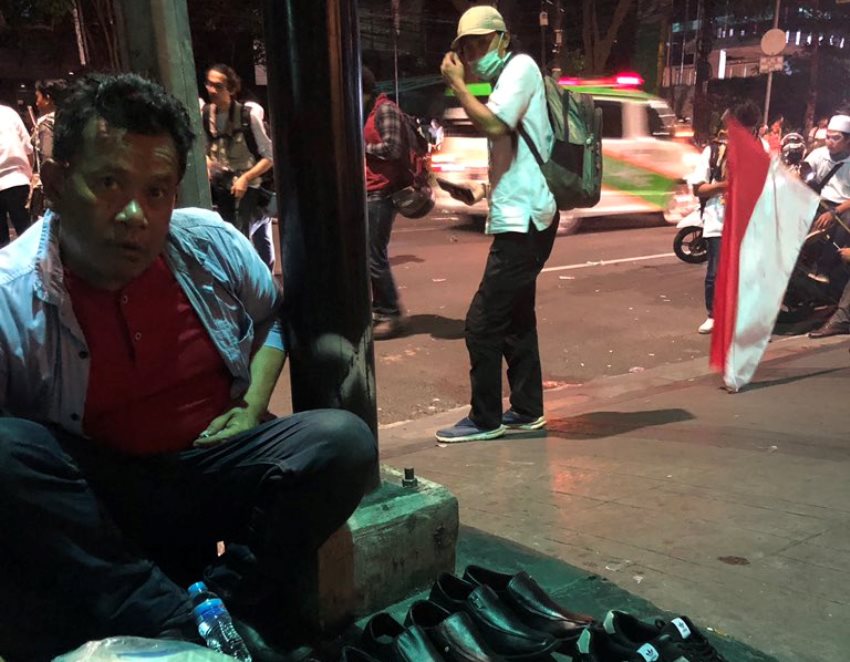 This legend was trying to sell me a pair of shoes in the middle of a riot. “Mister! Only 100 thousand” #JakartaRiots pic.twitter.com/D6y0VchmxS