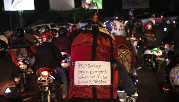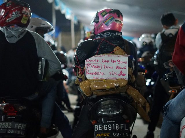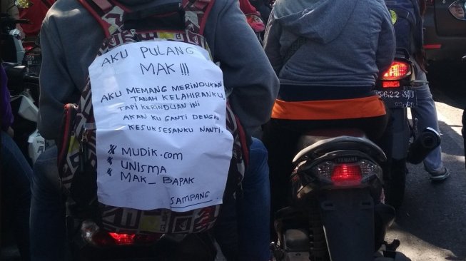 Para pemudik menempel tulisan lucu di belakang sepeda motor. Namun ada juga yang menempelnya di tas gendong agar kelihatan oleh pemudik lain.