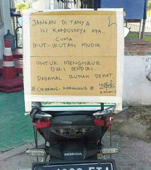 Meski tidak sedikit pula dalam beberapa meme lucu tulisan di motor saat mudik ini menyebut mereka nekat pulang ke kampung halaman tercinta meski duit pas-pasan.