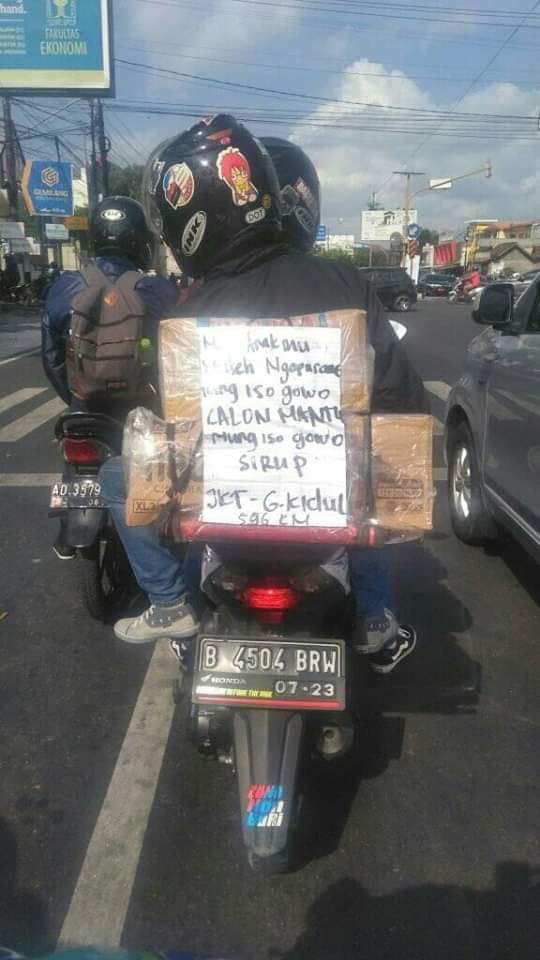 Bagaimana tidak lucu, tulisan yang dibawa pemudik motor yang rata-rata masih jomblo itu merasa menyesal lantaran saat mudik tahun ini masih saja belum membawa pasangan atau calon menantu.