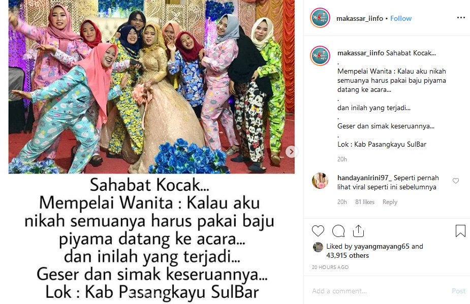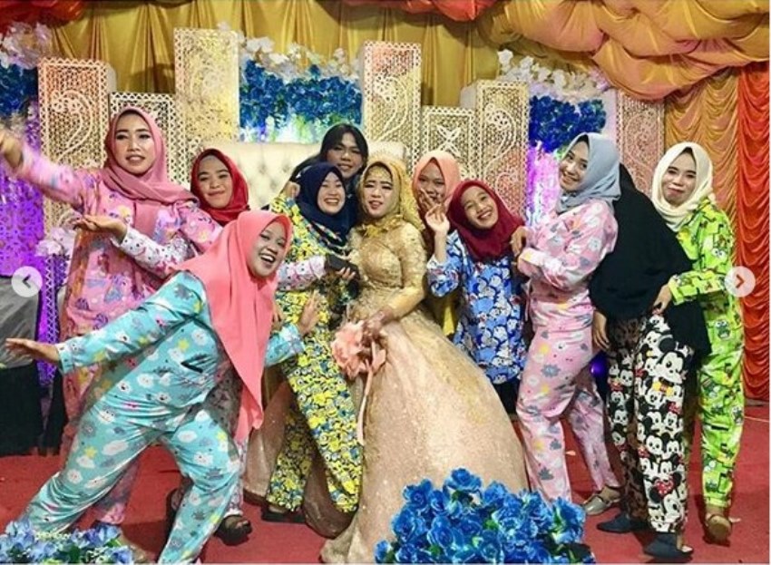 Permintaan itu pun benar-benar diwujudkan oleh teman-teman sang mempelai wanita, mereka benar datang dengan memakai piyama.