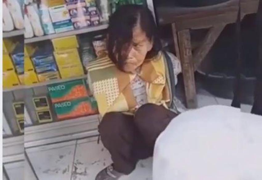 Dari video yang beredar, tampak perempuan paruh baya itu diikat di tiang sebuah toko dengan posisi duduk.