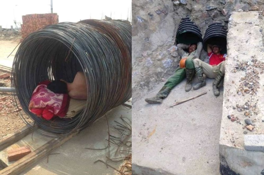 Beberapa bahkan menggunakan terpal sebagai selimut. Sementara pekerja lainnya membuat tempat tidur sendiri dari silinder logam yang besar.