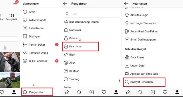 3. Setelah masuk di menu Profile, klik icon garis tiga di pojok kanan dan klik pada menu Pengaturan > Keamanan > Riwayat Pencarian.