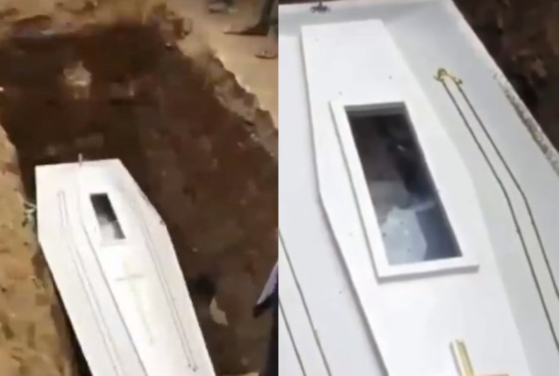 Seperti terlihat dalam video yang dibagikan oleh akun Twitter @DMenfess1. Dalam video tersebut sesosok jenazah di dalam peti mati tampak sudah berada di liang lahat untuk dikuburkan.