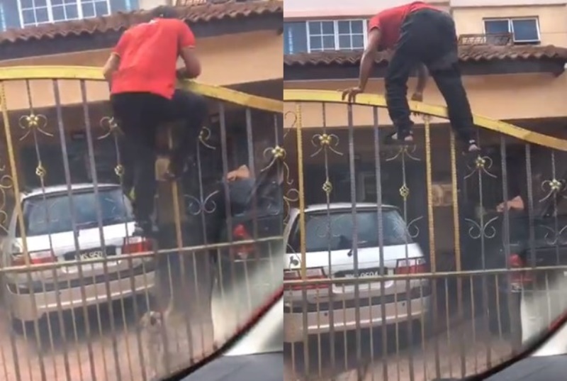 Petugas kurir yang mengenakan seragam berwarna merah itu tampak sangat ketakutan, hingga akhir video ia belum turun dari atas pagar.