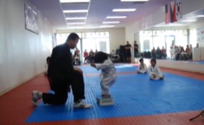 “Bertempat di Peak Taekwondo & Fitness Center, Temecula, California seorang bocah 3 tahun menjalani tes untuk mendapatkan sabuk putih. Bocah itu tampak sangat antusias menirukan gerakan pelatihnya memecahkan papan.