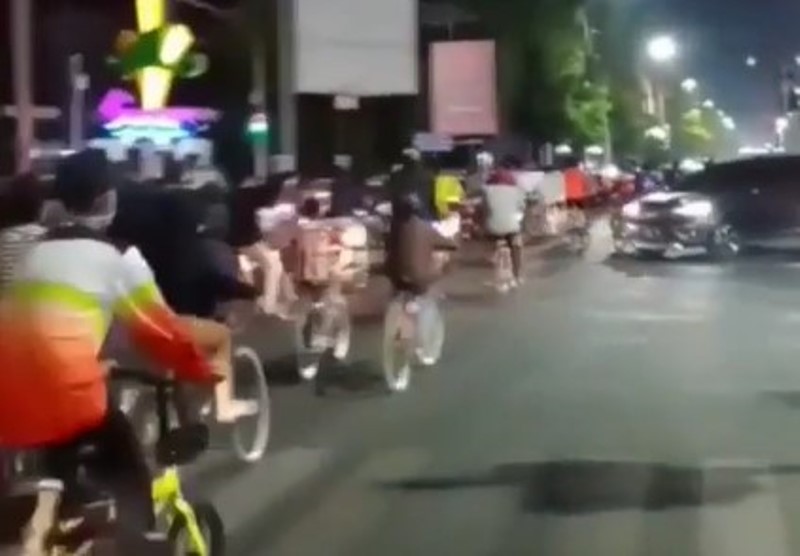 Dalam rekaman video tersebut, terlihat sejumlah pesepeda yang gowes di malam hari dan ada beberapa yang tidak mengenakan masker.